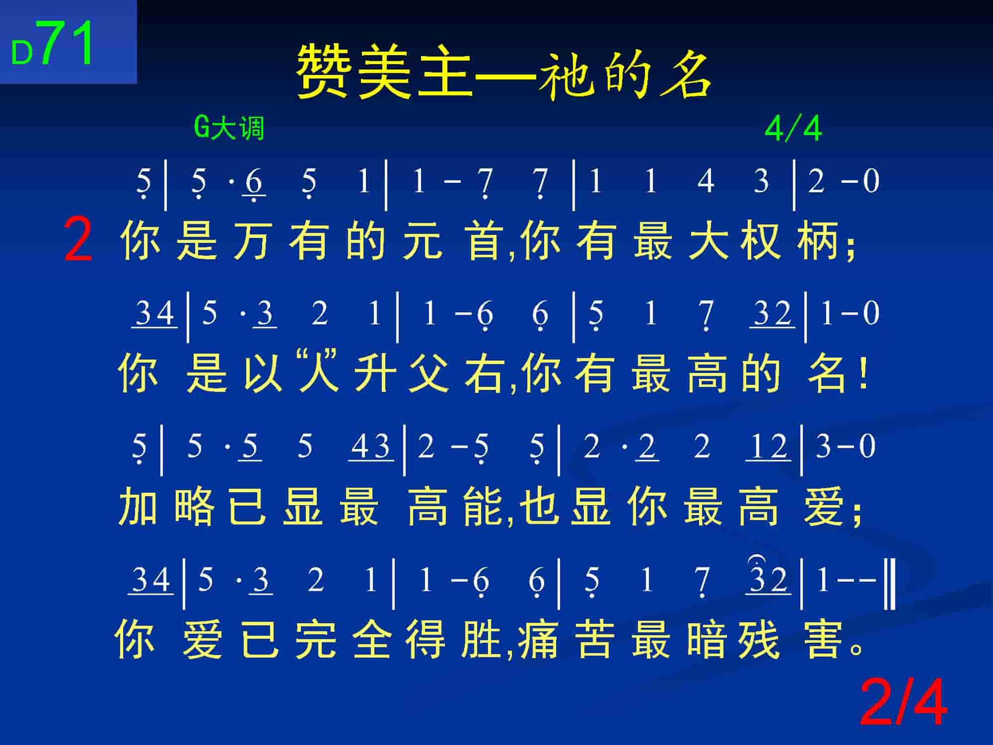 你是万有的元首,你有最大权柄;你是以“人”升父右,你有最高的名!加略已显最高能,也显你最高爱;你爱已完全得胜,痛苦最暗残害。