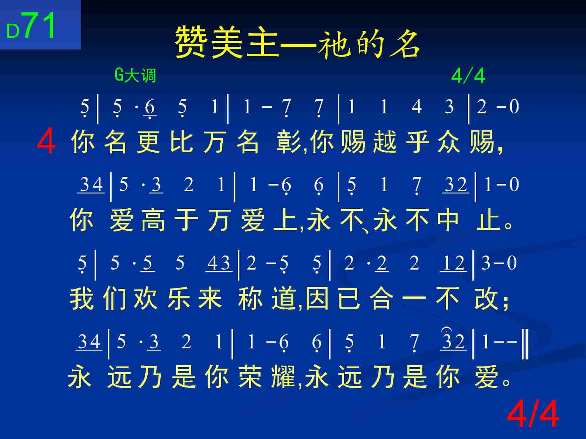 你名更比万名彰,你赐越乎众赐,你爱高于万爱上,永不、永不中止。我们欢乐来称道,因已合一不改;永远乃是你荣耀,永远乃是你爱。