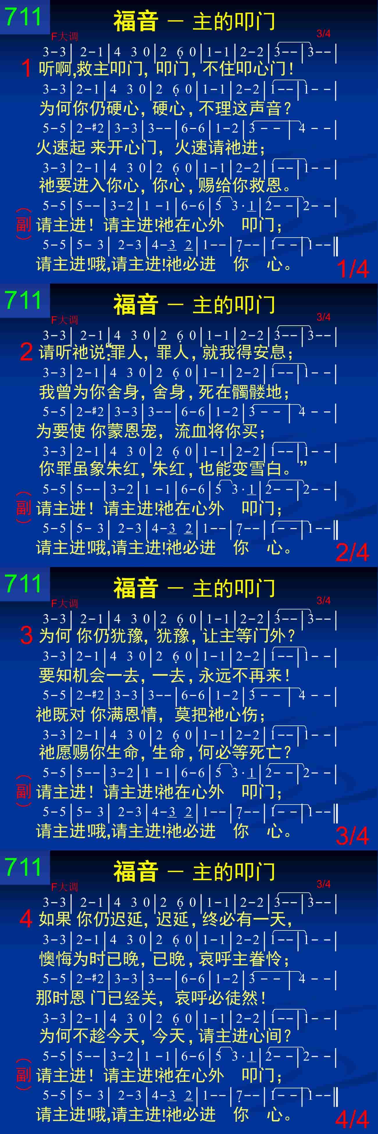 听啊,救主叩门,叩门,不住叩心门!为何你仍硬心,硬心,不理这声音?火速起来开心门,火速请祂进;祂要进入你心,你心,赐给你救恩。