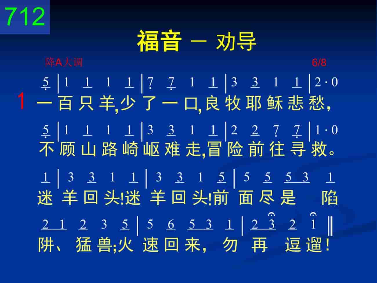 一百只羊,少了一口,良牧耶稣悲愁,不顾山路崎岖难走,冒险前往寻救。迷羊回头!迷羊回头!前面尽是陷阱、猛兽;火速回来,勿再逗遛!