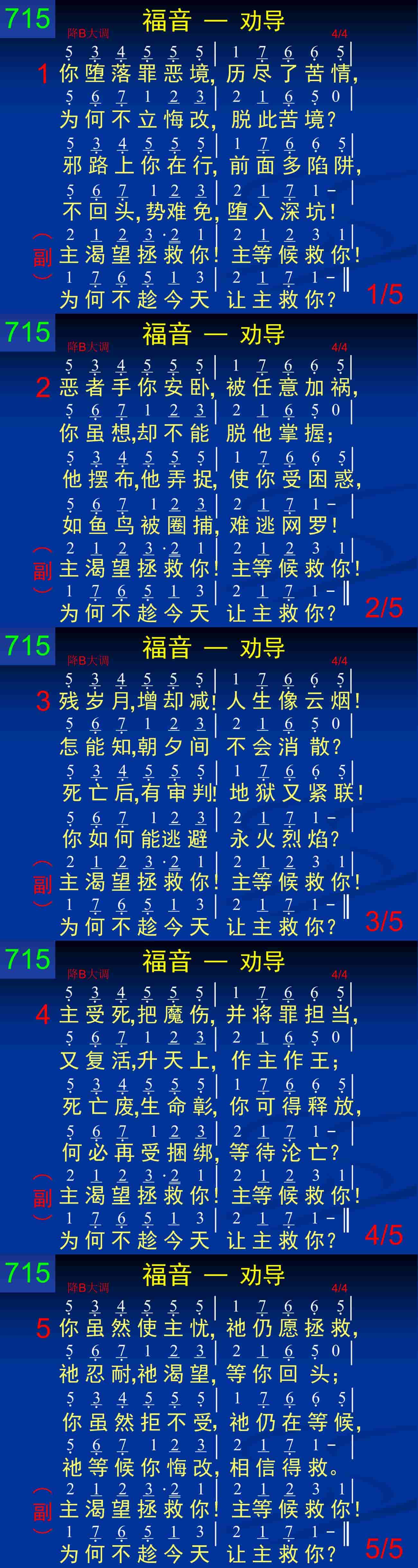 你堕落罪恶境,历尽了苦情,为何不立悔改,脱此苦境?邪路上你在行,前面多陷阱,不回头,势难免,堕入深坑!