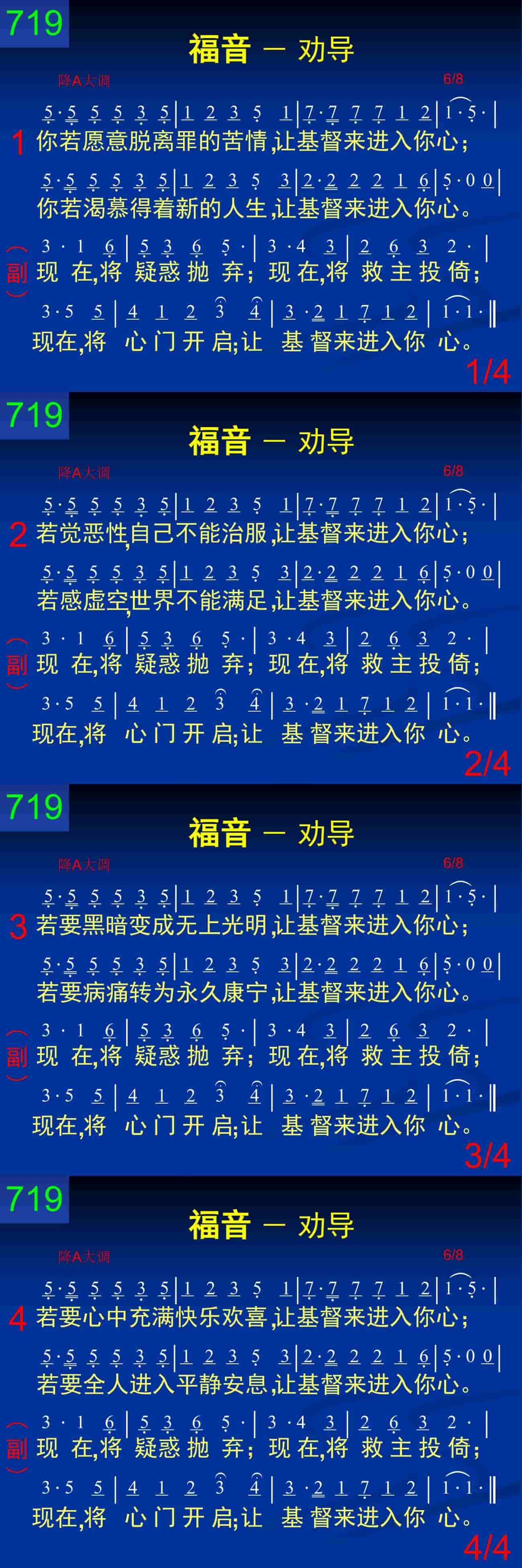 现在,将疑惑抛弃;现在,将救主投倚;现在,将心门开启;让基督来进入你心。