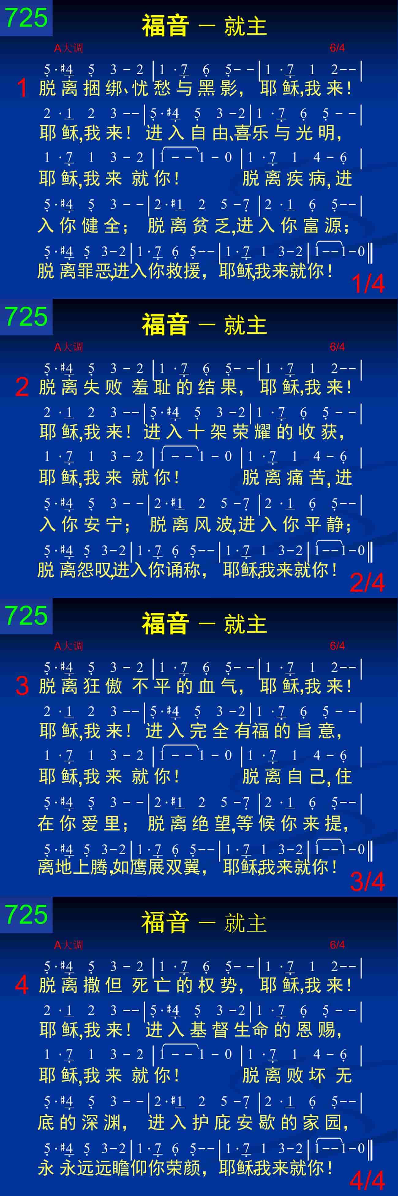 脱离捆绑、忧愁与黑影,耶稣,我来!耶稣,我来!进入自由、喜乐与光明,耶稣,我来就你!脱离疾病,进入你健全;脱离贫乏,进入你富源;脱离罪恶,进入你救援,耶稣,我来就你!