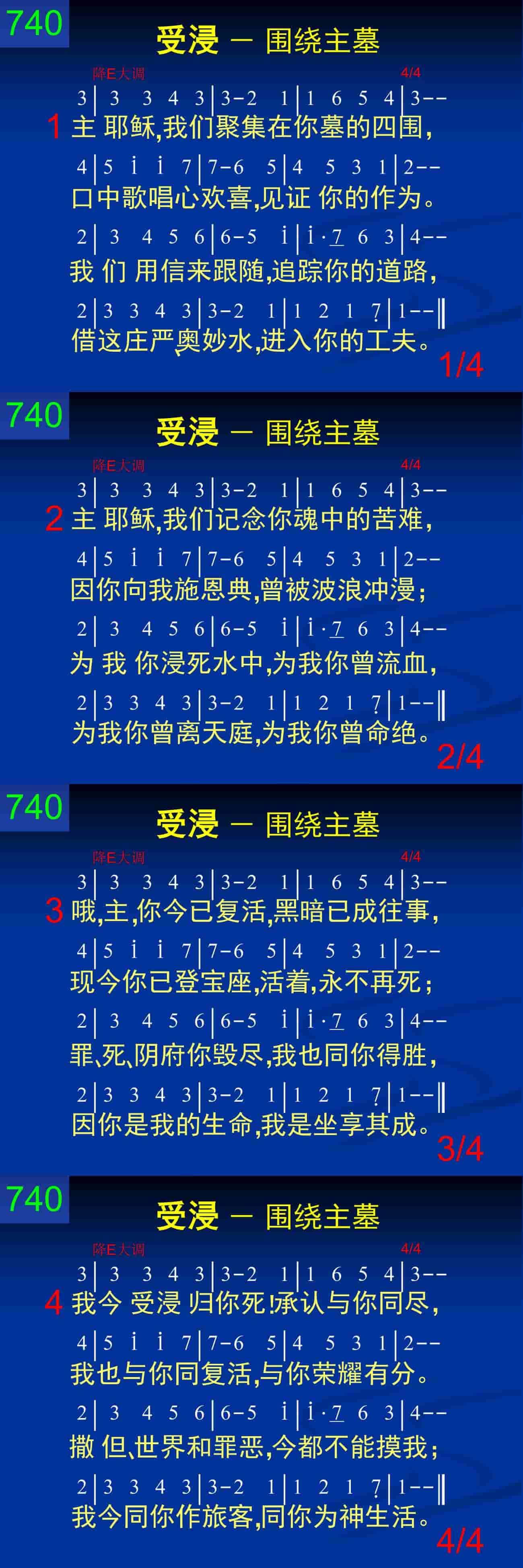 哦,主,你今已复活,黑暗已成往事,现今你已登宝座,活着,永不再死;罪、死、阴府你毁尽,我也同你得胜,因你是我的生命,我是坐享其成。