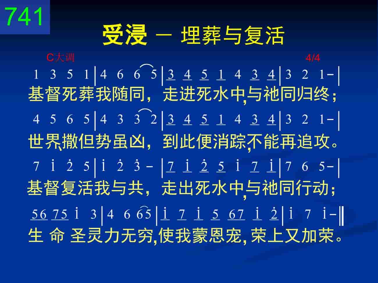 基督死葬我随同,走进死水中,与祂同归终;世界、撒但势虽凶,到此便消踪,不能再追攻。基督复活我与共,走出死水中,与祂同行动;生命圣灵力无穷,使我蒙恩宠,荣上又加荣。