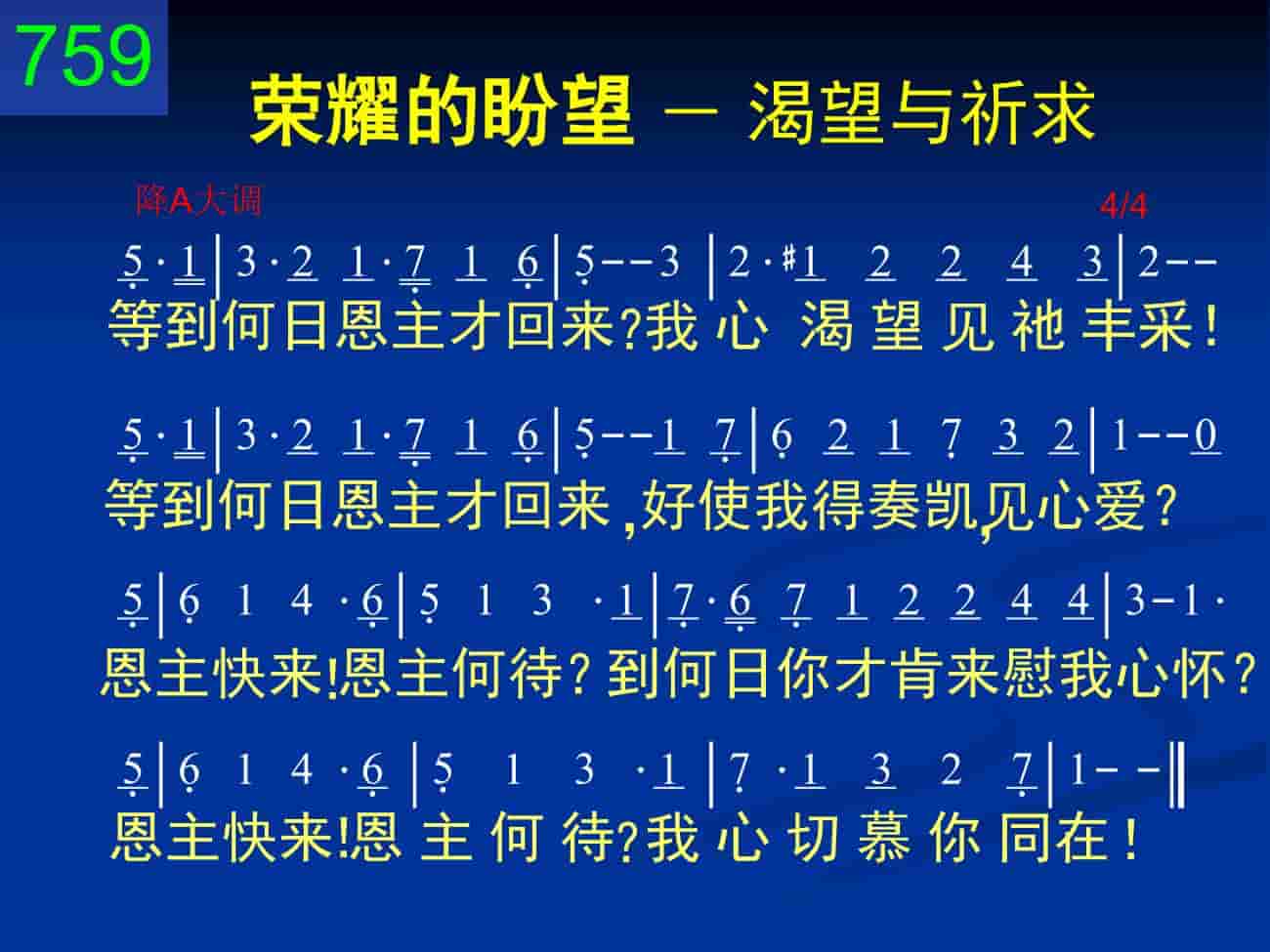 等到何日恩主才回来?我心渴望见祂丰采!等到何日恩主才回来,好使我得奏凯,见心爱?恩主快来!恩主何待?到何日你才肯来慰我心怀?恩主快来!恩主何待?我心切慕你同在!