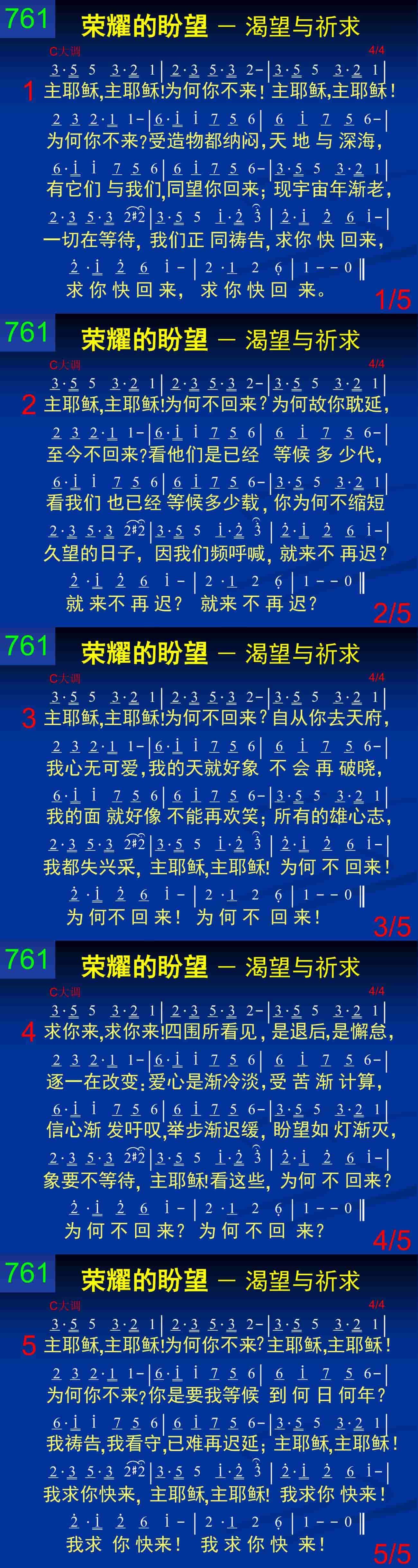 主耶稣,主耶稣!为何你不来?主耶稣,主耶稣!为何你不来?你是要我等候到何日何年?我祷告,我看守,已难再迟延;主耶稣,主耶稣!我求你快来,主耶稣,主耶稣!我求你快来!