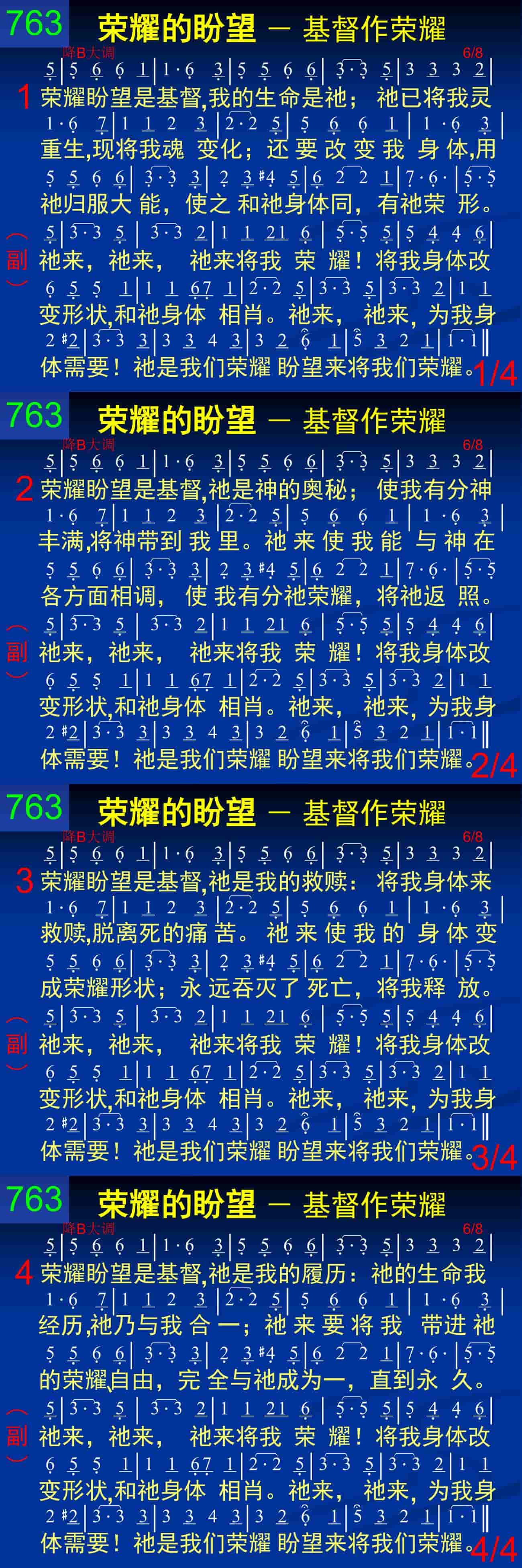 荣耀盼望是基督,我的生命是祂;祂已将我灵重生,现将我魂变化;还要改变我身体,用祂归服大能,使之和祂身体同,有祂荣形。