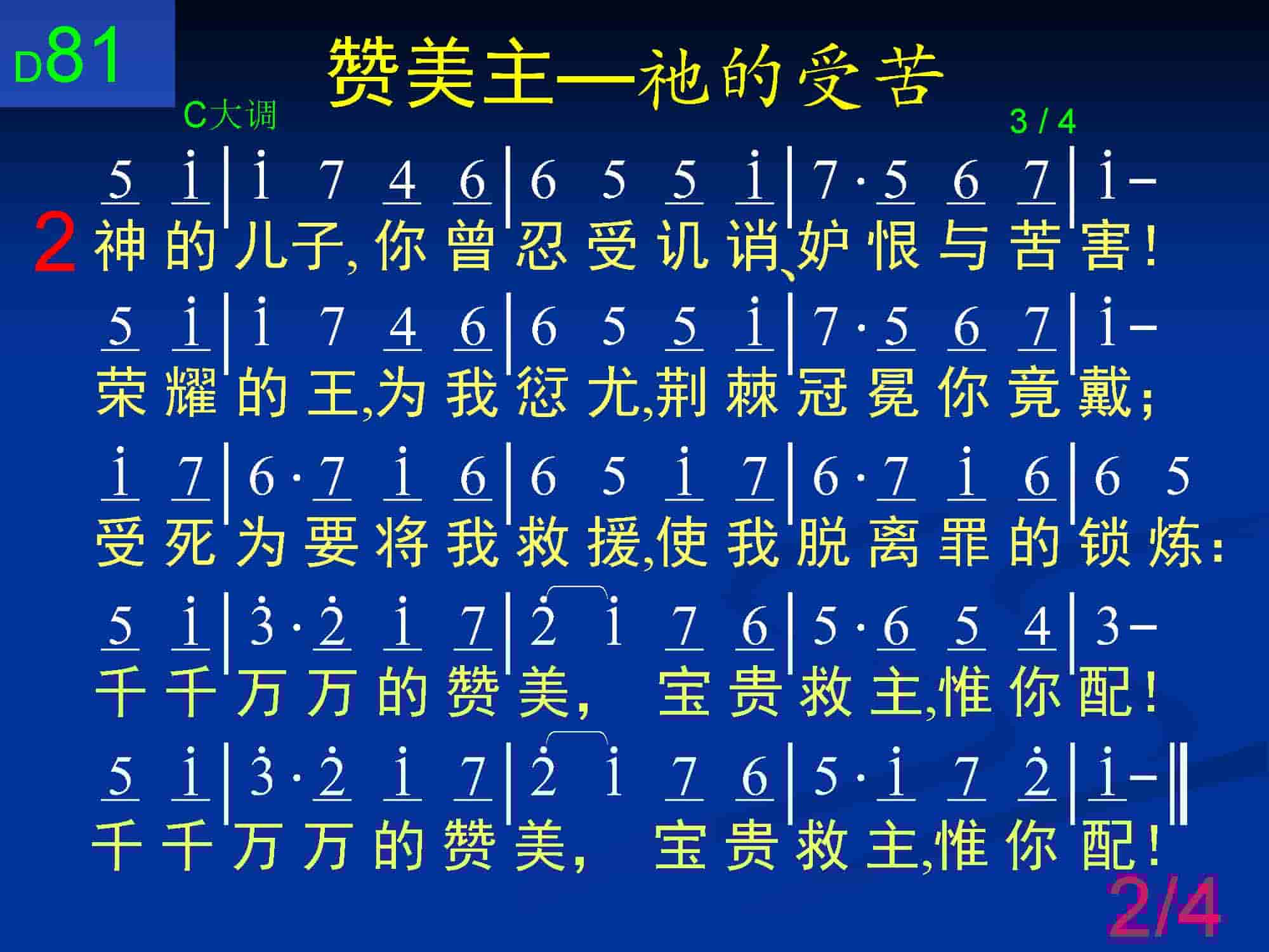 神的儿子,你曾忍受讥诮、妒恨与苦害!荣耀的王,为我愆尤,荆棘冠冕你竟戴;受死为要将我救援,使我脱离罪的锁链:千千万万的赞美,宝贵救主,唯你配!