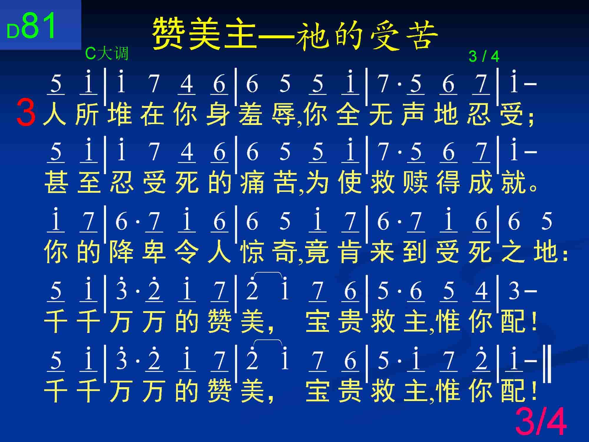 人所堆在你身羞辱,你全无声的忍受;甚至忍受死的痛苦,为使救赎得成就。你的降卑令人惊奇,竟肯来到受死之地:千千万万的赞美,宝贵救主,唯你配!