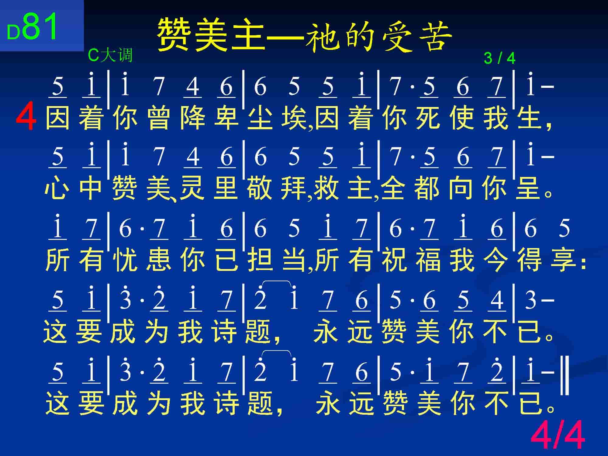 因着你曾降卑尘埃,因着你死使我生,心中赞美、灵里敬拜,救主,全都向你呈。所有忧患你已担当,所有祝福我今得享:这要成为我诗题,永远赞美你不已。