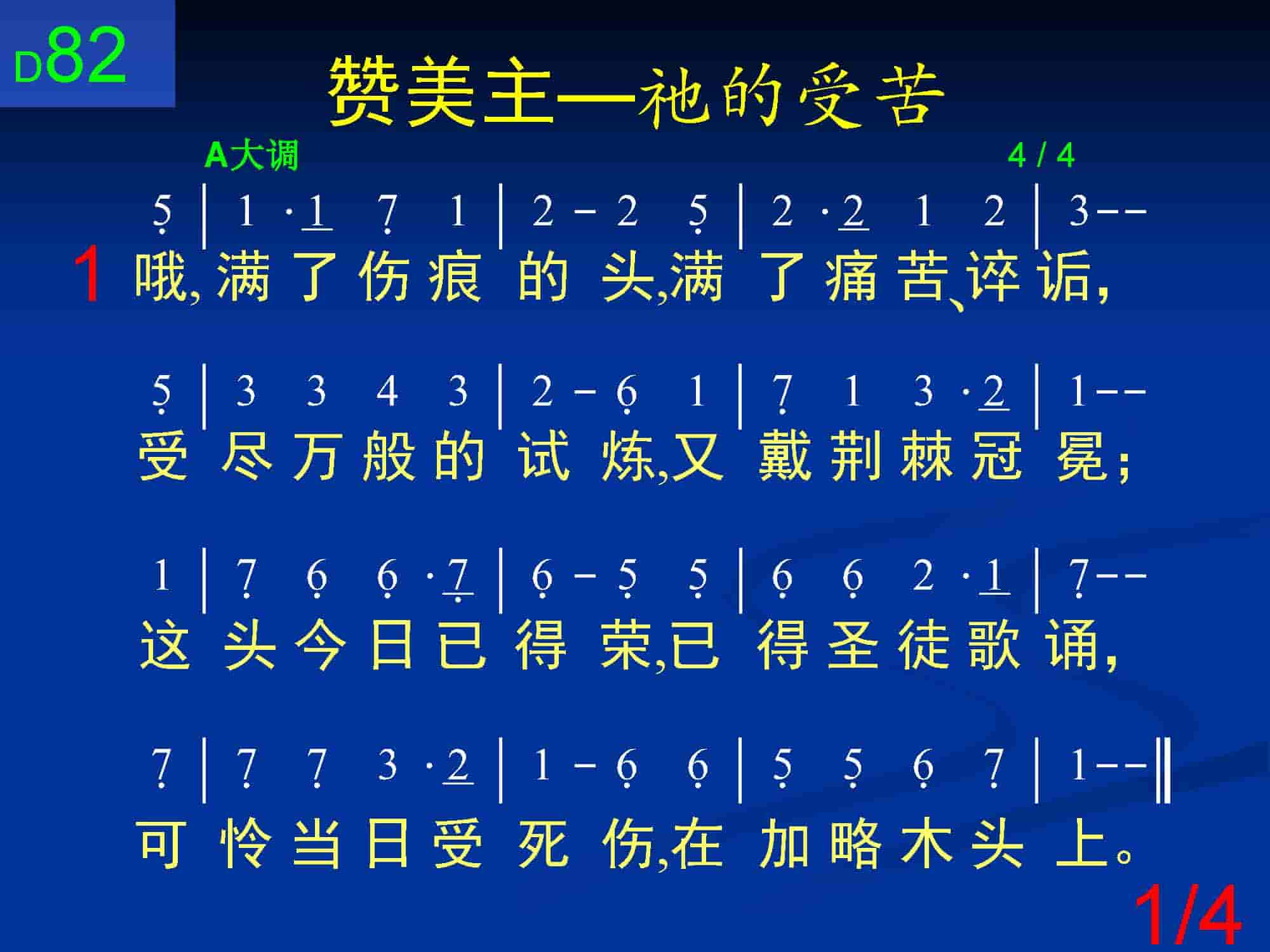 哦,满了伤痕的头,满了痛苦、谇诟[suì gòu责难辱骂],受尽万般的试炼,又戴荆棘冠冕;这头今日已得荣,已得圣徒歌诵,可怜当日受死伤,在加略木头上。