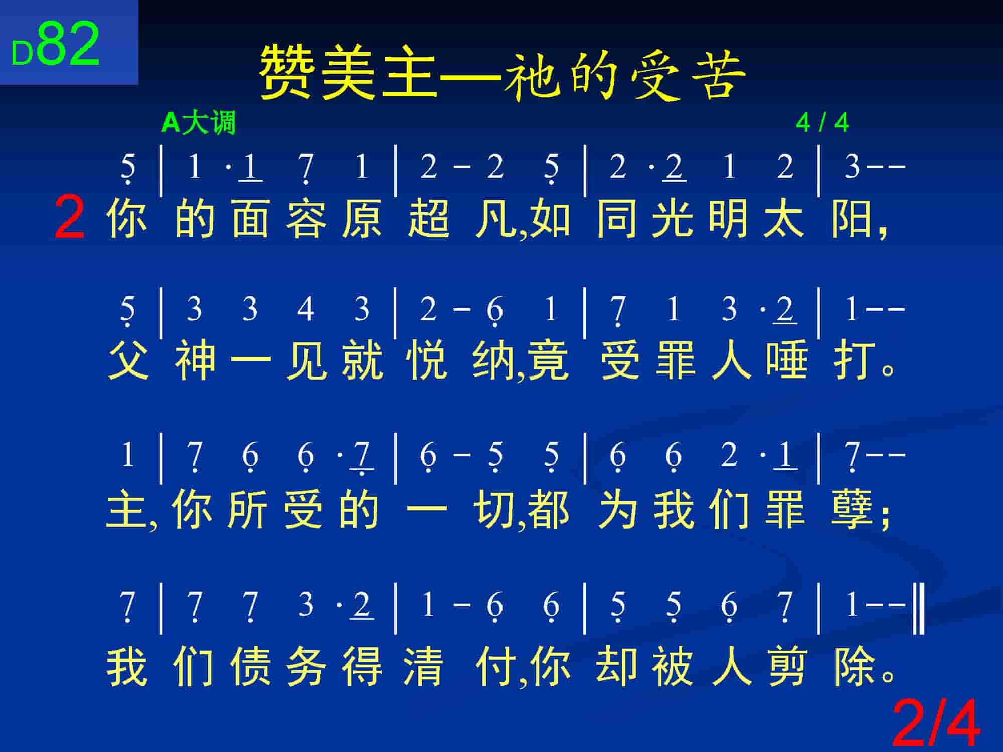 你的面容原超凡,如同光明太阳,父神一见就悦纳,竟受罪人唾[tuò]打。主,你所受的一切,都为我们罪孽;我们债务得清付,你却被人剪除。