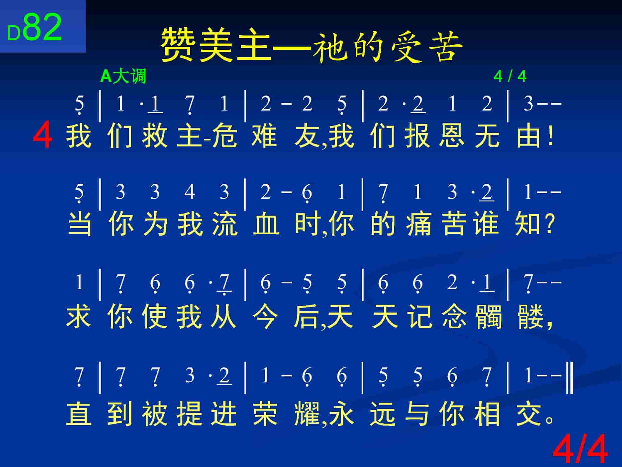 我们救主——危难友,我们报恩无由!当你为我流血时,你的痛苦谁知?求你使我从今后,天天记念髑髅[dú lóu],直到被提进荣耀,永远与你相交。