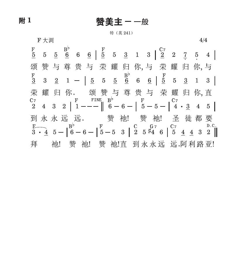 颂赞与尊贵与荣耀归你,与荣耀归你,与荣耀归你。颂赞与尊贵与荣耀归你,直到永永远远。赞祂!赞祂!圣徒都要拜祂!赞祂!赞祂!直到永永远远。阿利路亚!