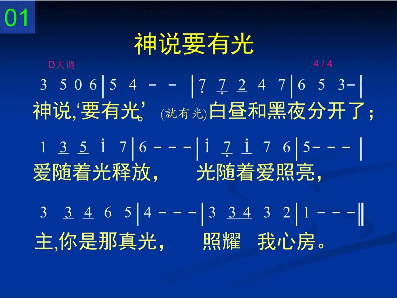 神说,‘要有光。’(就有光)白昼和黑夜分开了;爱随着光释放,光随着爱照亮,主,你是那真光,照耀我心房。