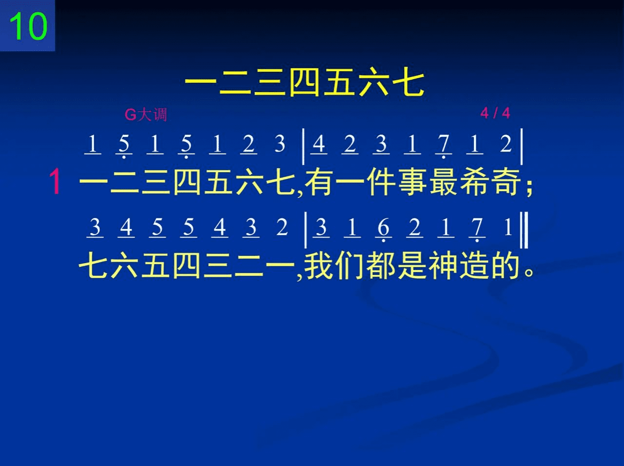 一二三四五六七,有一件事最希奇;七六五四三二一,我们都是神造的。
