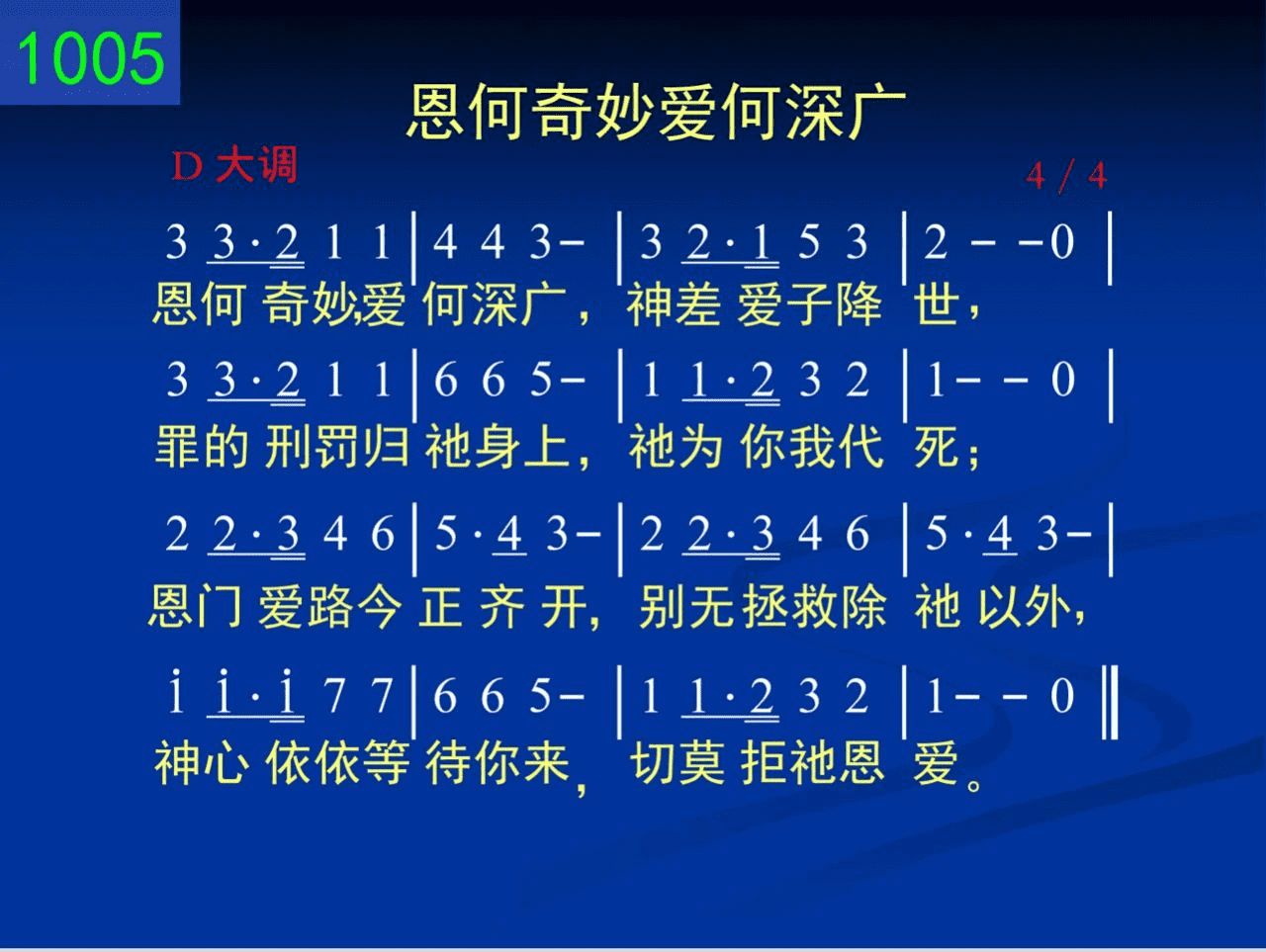 恩何奇妙,爱何深广,神差爱子降世,罪的刑罚归祂身上,祂为你我代死;恩门爱路今正齐开,别无拯救除祂以外,神心依依等待你来,切莫拒祂恩爱。