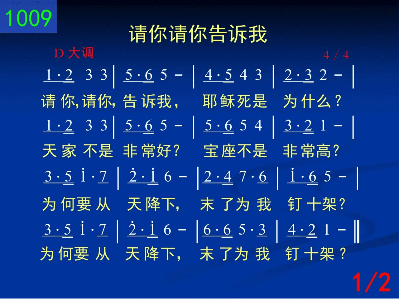 请你,请你,告诉我,耶稣死是为什么?天家不是非常好?宝座不是非常高?为何要从天降下,末了为我钉十架?为何要从天降下,末了为我钉十架?