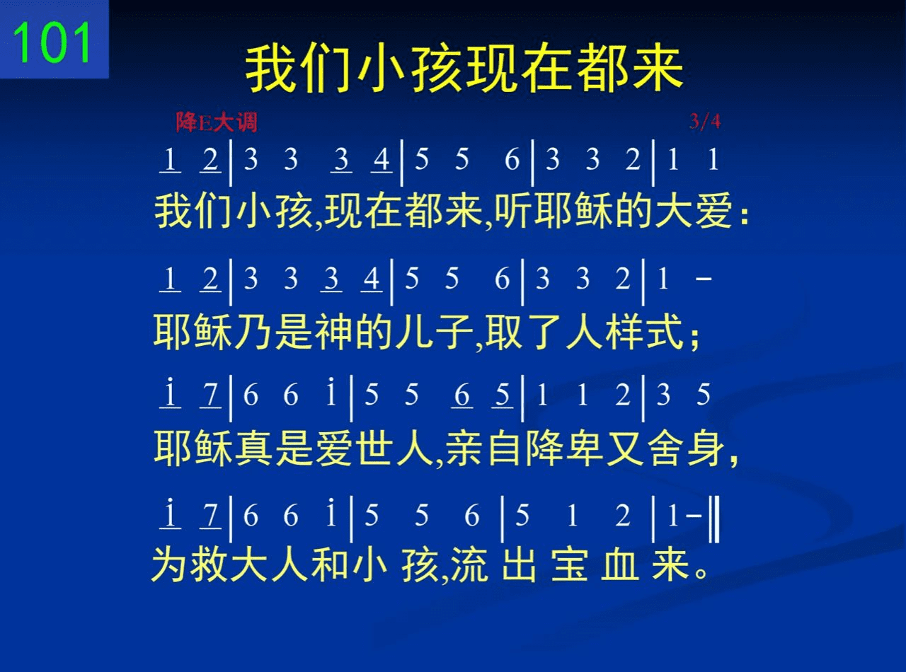 我们小孩,现在都来,听耶稣的大爱:耶稣乃是神的儿子,取了人样式;耶稣真是爱世人,亲自降卑又舍身,为救大人和小孩,流出宝血来。
