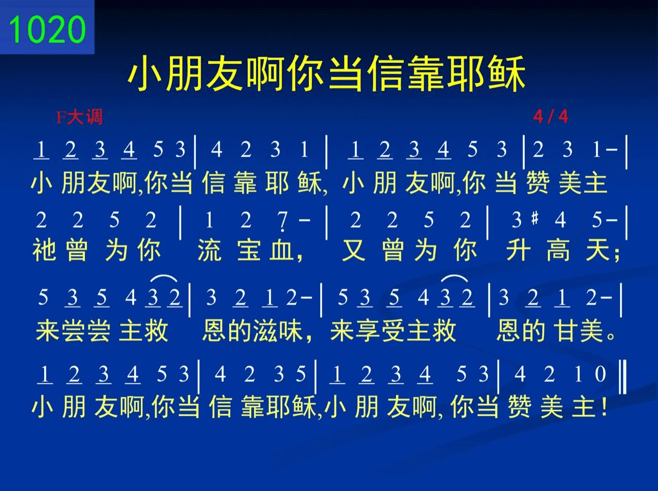 小朋友阿,你当信靠耶稣,小朋友阿,你当赞美主,祂曾为你流宝血,又曾为你升高天;来尝尝主救恩的滋味,来享受主救恩的甘美。小朋友阿,你当信靠耶稣,小朋友阿,你当赞美主!