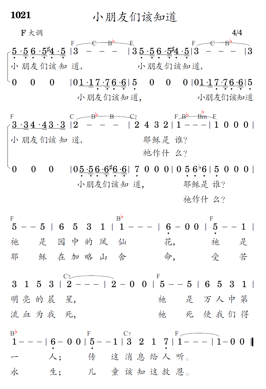 小朋友们该知道,(小朋友们该知道,)小朋友们该知道,(小朋友们该知道,)小朋友们该知道,(小朋友们该知道,)耶稣是谁?(耶稣是谁?)祂是园中的凤仙花,祂是明亮的晨星,祂是万人中第一人;传这消息给人听。