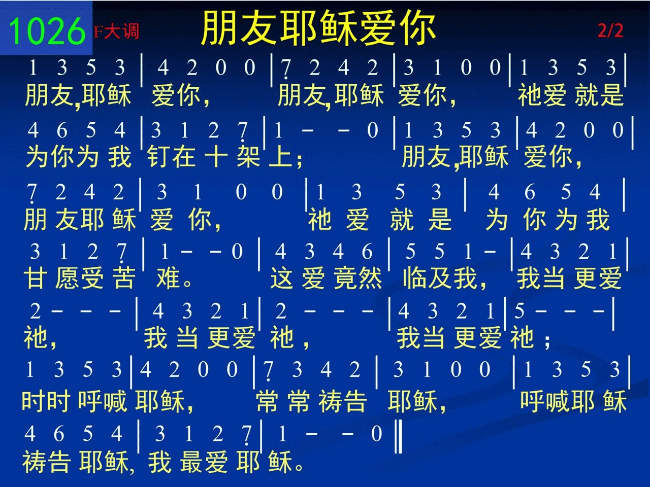 朋友,耶稣爱你,朋友,耶稣爱你,祂爱就是为你为我钉在十架上;朋友,耶稣爱你,朋友,耶稣爱你,祂爱就是为你为我甘愿受苦难。这爱竟然临及我,我当更爱祂,我当更爱祂,我当更爱祂;时时呼喊耶稣,常常祷告耶稣,呼喊耶稣,祷告耶稣,我最爱耶稣。