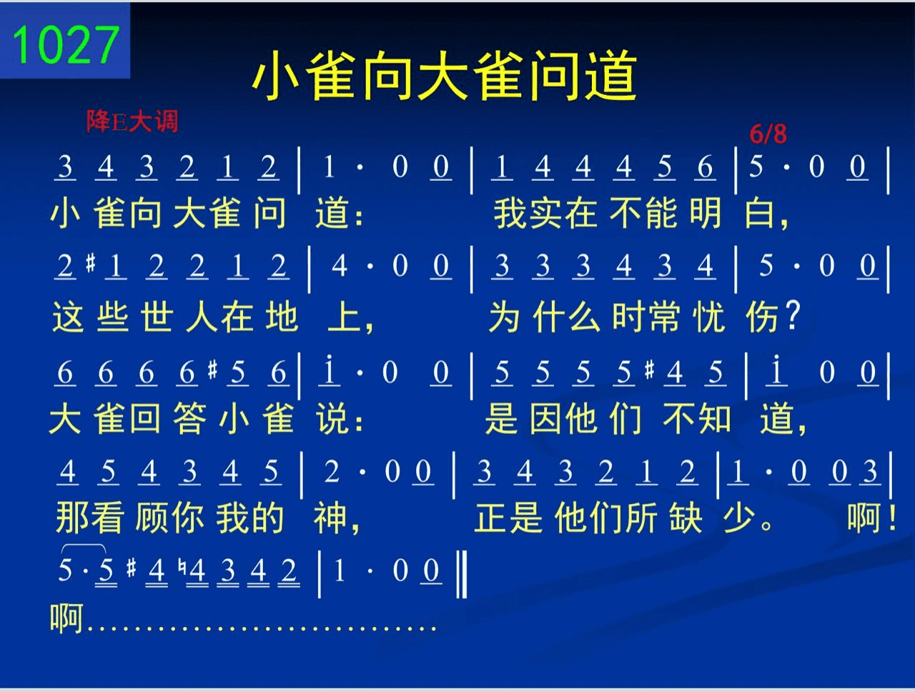 小雀向大雀问道:我实在不能明白,这些世人在地上,为什么时常忧伤?大雀回答小雀说:是因他们不知道,那看顾你我的神,正是他们所缺少。阿!阿…………………