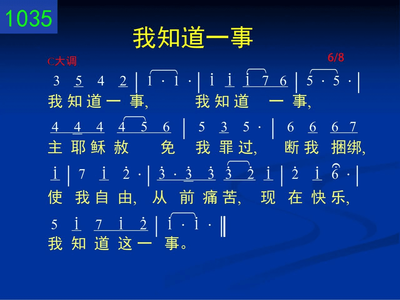 我知道一事,我知道一事,主耶稣赦免我罪过,断我捆绑,使我自由,从前痛苦,现在快乐,我知道这一事。