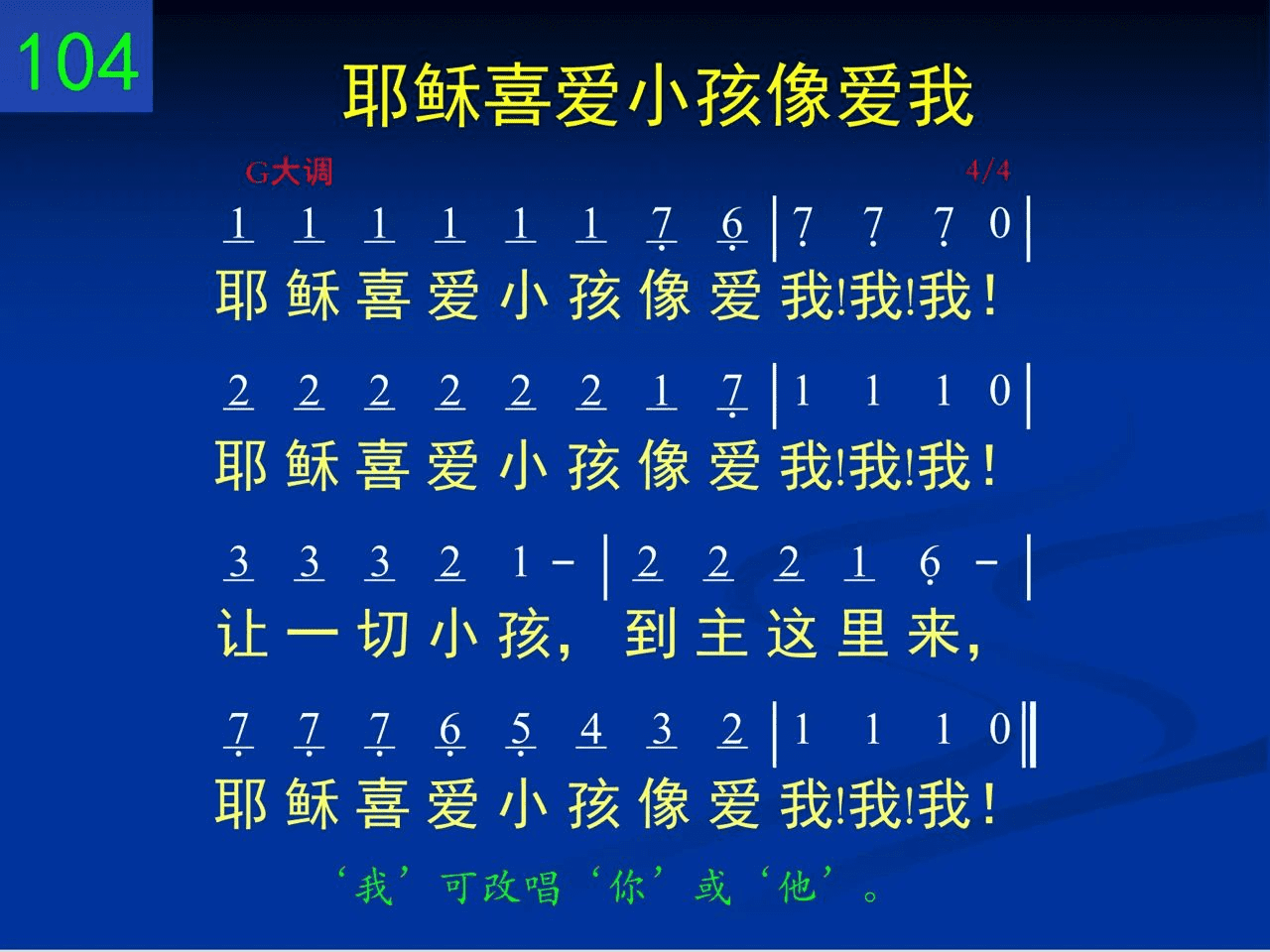 耶稣喜爱小孩像爱我!我!我!耶稣喜爱小孩像爱我!我!我!让一切小孩,到主这里来,耶稣喜爱小孩像爱我!我!我!