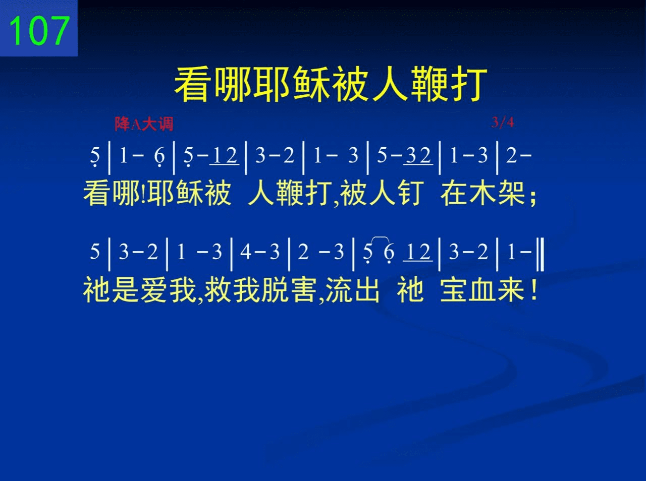 看哪!耶稣被人鞭打,被人钉在木架;祂是爱我,救我脱害,流出祂宝血来!