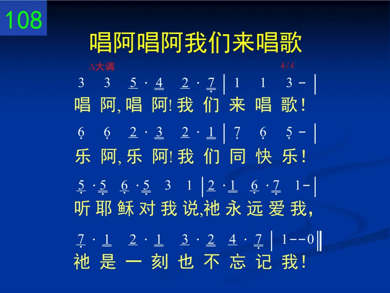 唱阿,唱阿!我们来唱歌!乐阿,乐阿!我们同快乐!听耶稣对我说,祂永远爱我,祂是一刻也不忘记我!