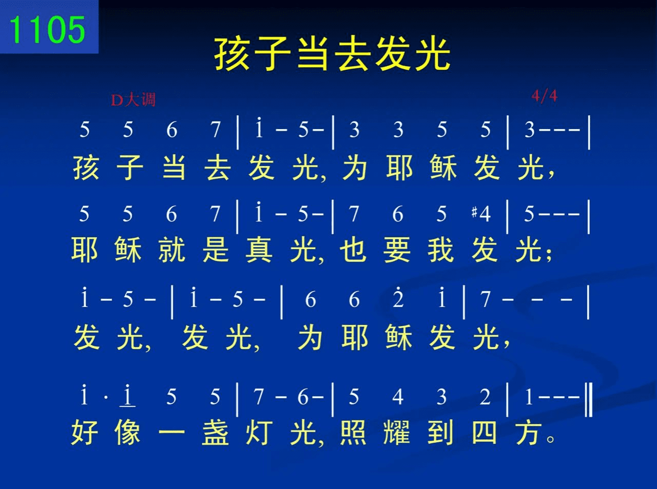 孩子当去发光,为耶稣发光,耶稣就是真光,也要我发光;发光,发光,为耶稣发光,好像一盏灯光,照耀到四方。