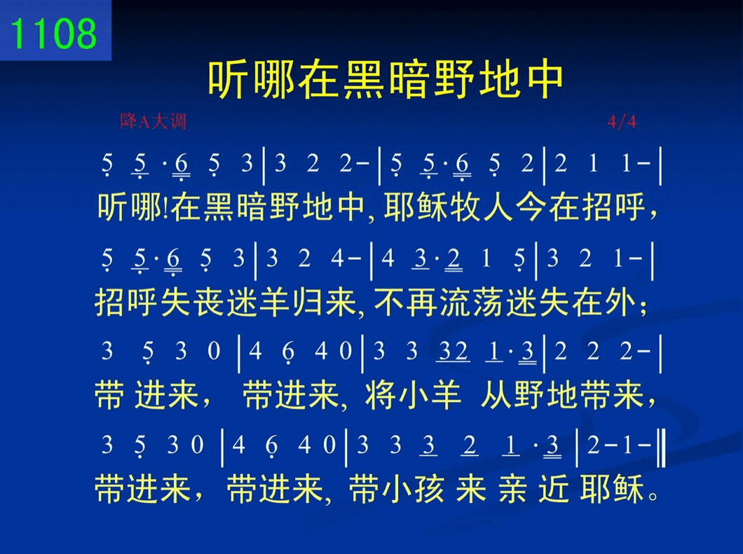 听哪!在黑暗野地中,耶稣牧人今在招呼,招呼失丧迷羊归来,不再流荡迷失在外;带进来,带进来,将小羊从野地带来,带进来,带进来,带小孩来亲近耶稣。