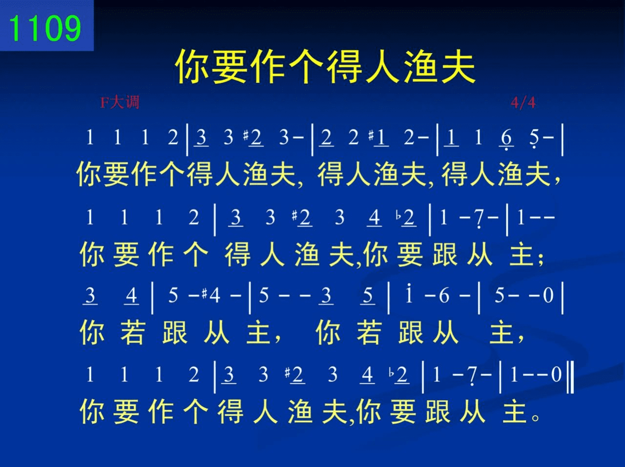 你要作个得人渔夫,得人渔夫,得人渔夫,你要作个得人渔夫,你要跟从主;你若跟从主,你若跟从主,你要作个得人渔夫,你要跟从主。