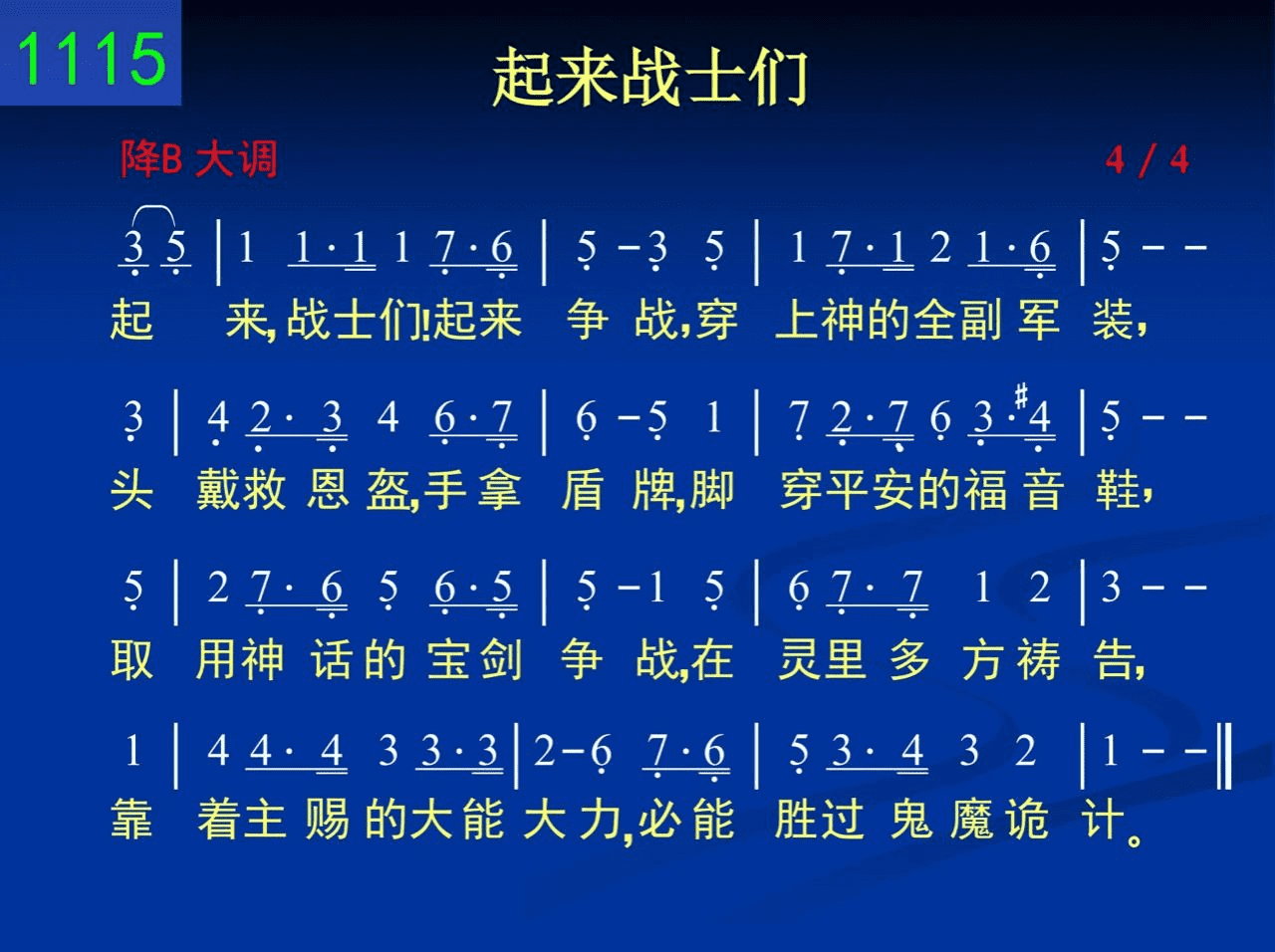起来,战士们!起来争战,穿上神的全副军装,头戴救恩盔,手拿盾牌,脚穿平安的福音鞋,取用神话的宝剑争战,在灵里多方祷告,靠着主赐的大能大力,必能胜过魔鬼诡计。
