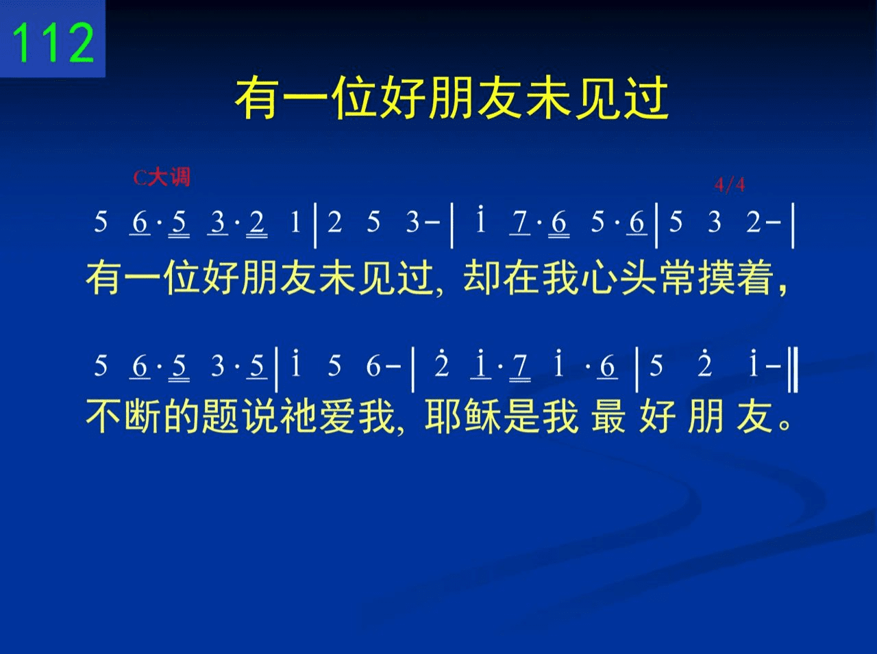 有一位好朋友未见过,却在我心头常摸着,不断的题说祂爱我,耶稣是我最好朋友。