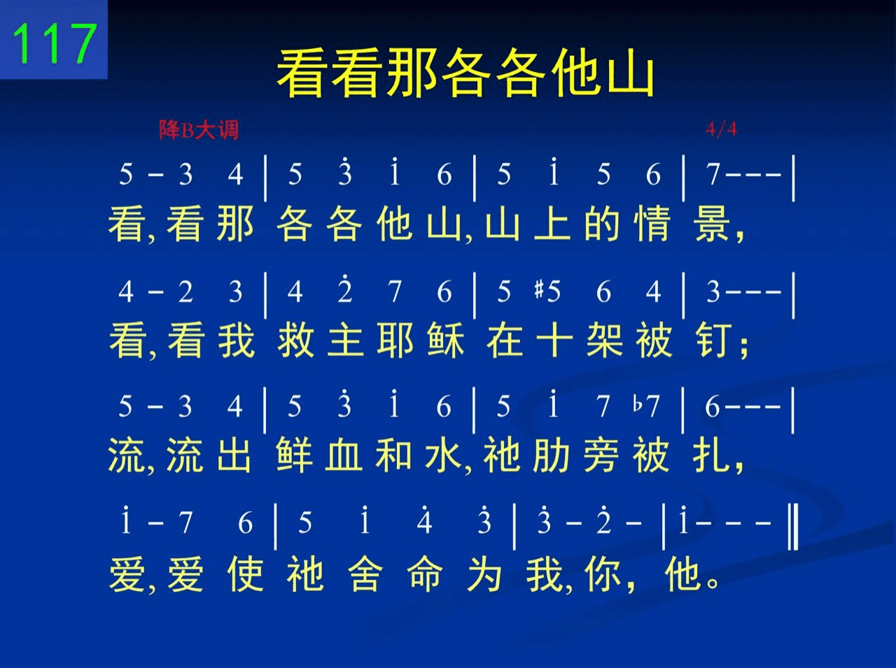 看,看那各各他山,山上的情景,看,看我救主耶稣在十架被钉;流,流出鲜血和水,祂肋旁被扎,爱,爱使祂舍命为我,你,他。