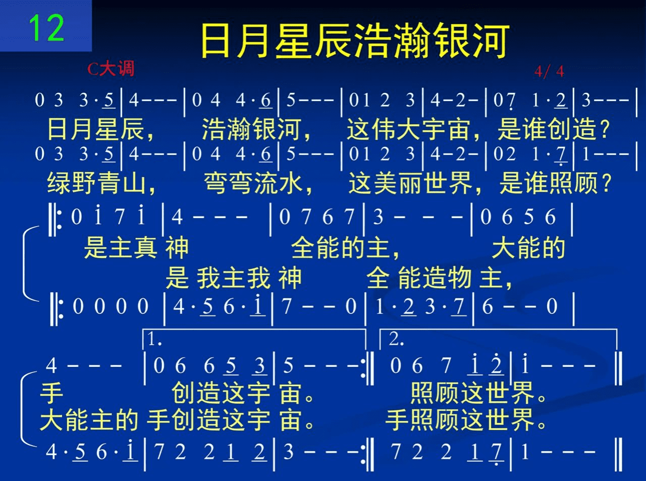 日月星辰,浩瀚银河,这伟大宇宙,是谁创造?履惆青山,弯弯流水,这美丽世界,是谁照顾?是主真神(是我主我神)全能的主,(全能造物主)大能的手(大能主的手)创造这宇宙。是主真神(是我主我神)全能的主,(全能造物主)大能的手(大能主的手)照顾这世界。
