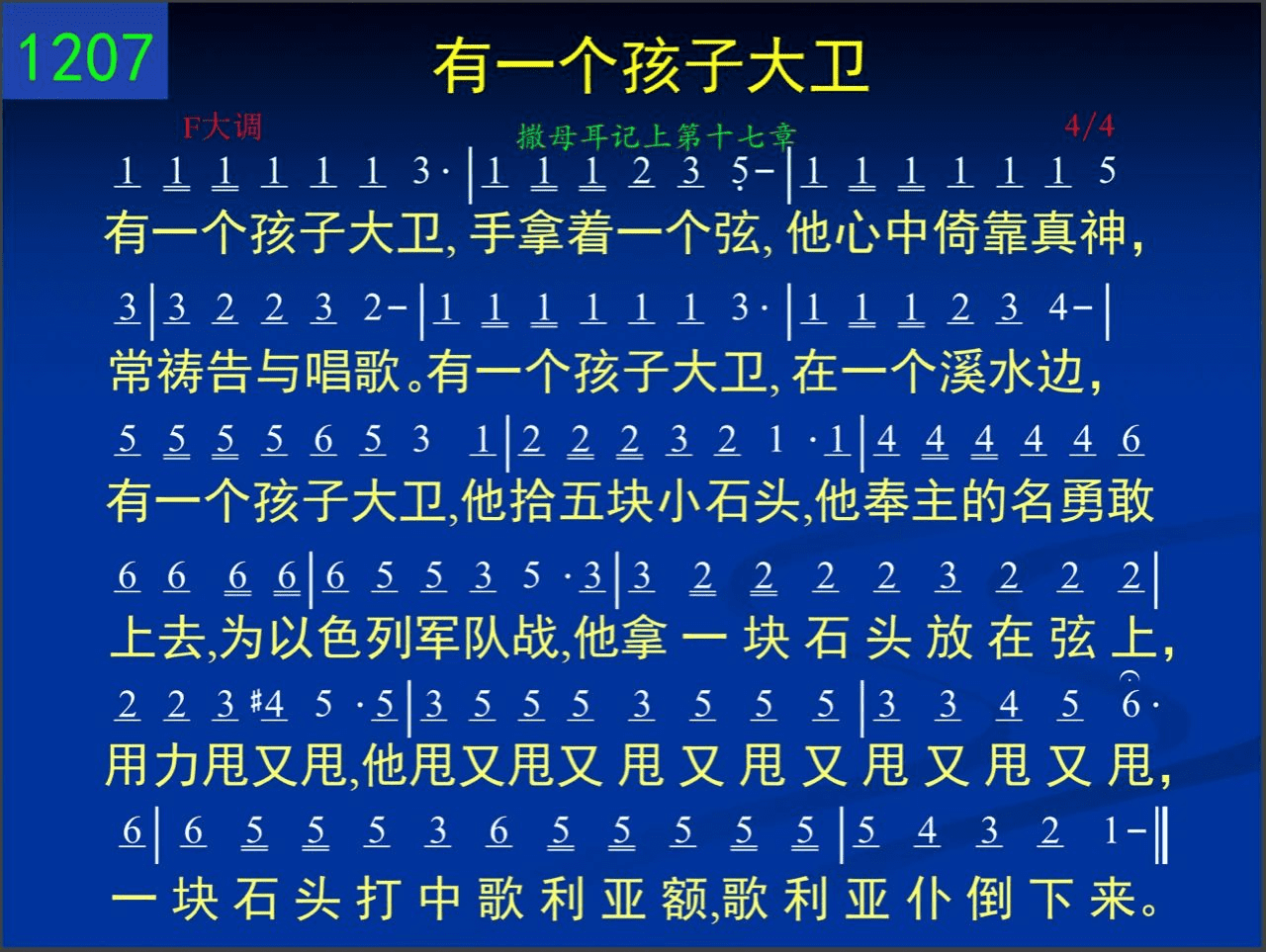有一个孩子大卫,手拿着一个弦,他心中倚靠真神,常祷告与唱歌。有一个孩子大卫,在一个溪水边,有一个孩子大卫,他拾五块小石头,他奉主的名勇敢上去,为以色列军队战,他拿一块石头放在弦上,用力甩又甩,他甩又甩又甩又甩又甩又甩又甩,一块石头打中歌利亚额,歌利亚仆倒下来。