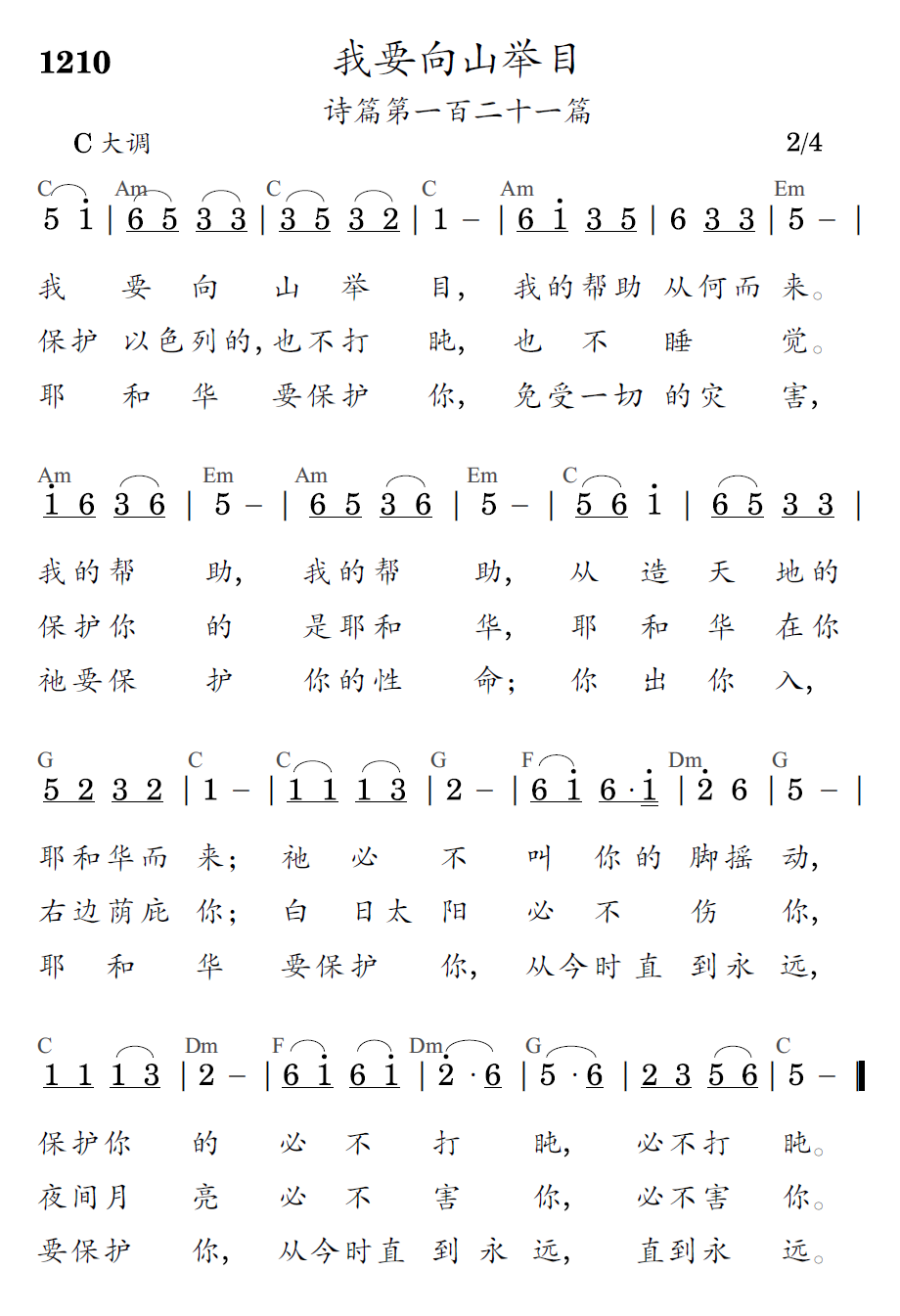 我要向山举目,我的帮助从何而来。我的帮助,我的帮助,从造天地的耶和华而来;祂必不叫你的脚摇动,保护你的必不打盹,必不打盹。