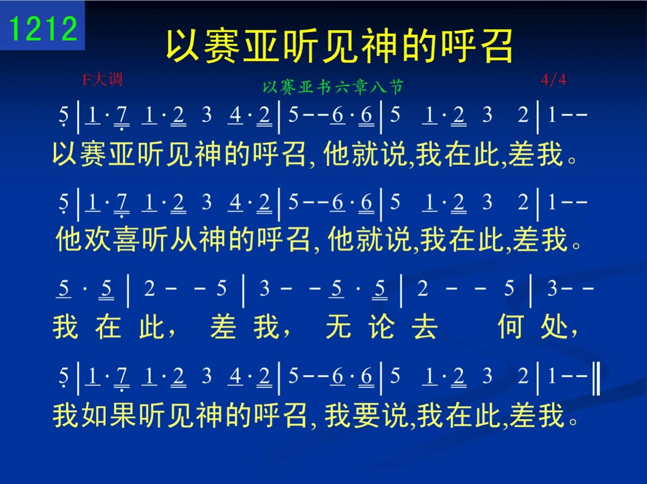 以赛亚听见神的呼召,他就说,我在此,差我。他欢喜听从神的呼召,他就说,我在此,差我。我在此,差我,无论去何处,我如果听见神的呼召,我要说,我在此,差我。