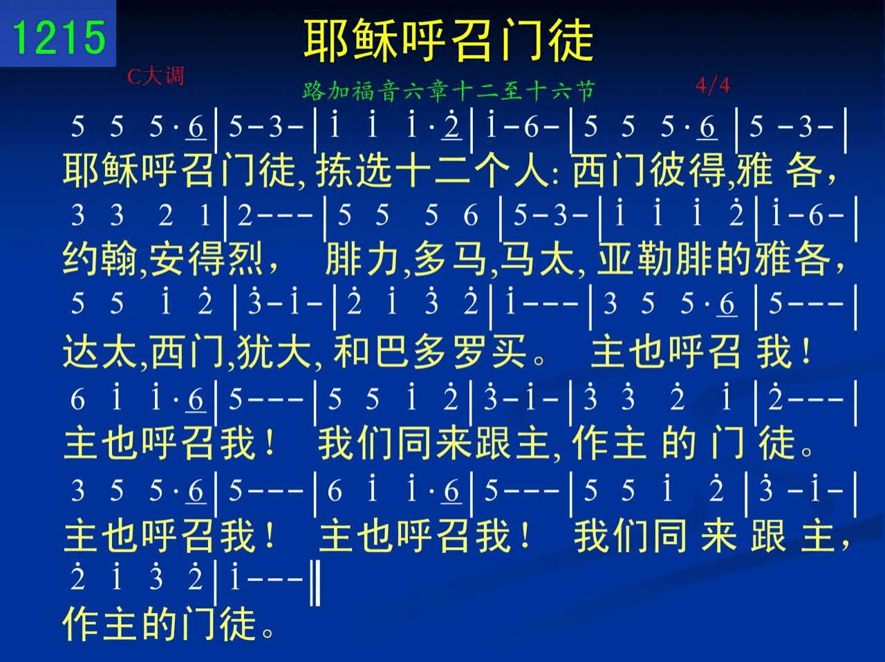 耶稣呼召门徒,拣选十二个人:西门彼得,雅各,约翰,安得烈,腓力,多马,马太,亚勒腓的雅各,达太,西门,犹大,和巴多罗买。主也呼召我!主也呼召我!我们同来跟主,作主的门徒。主也呼召我!主也呼召我!我们同来跟主,作主的门徒。