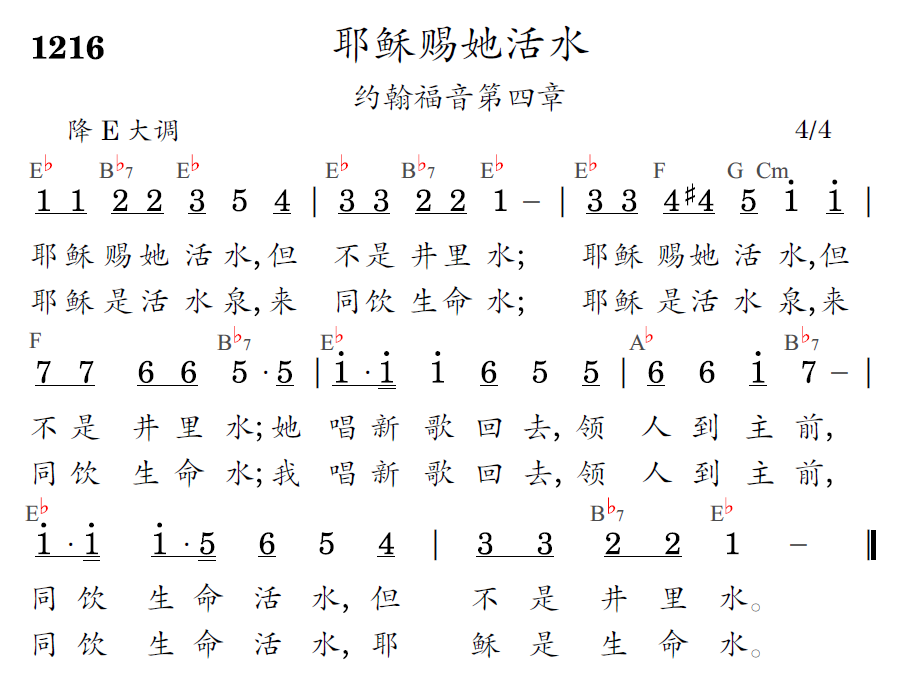 耶稣赐她活水,但不是井里水;耶稣赐她活水,但不是井里水;她唱新歌回去,领人到主前,同饮生命活水,但不是井里水。