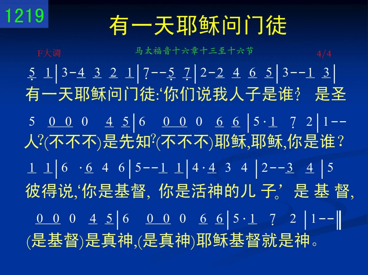 有一天耶稣问门徒:‘你们说我人子是谁?’是圣人?(不不不)是先知?(不不不)耶稣,耶稣,你是谁?彼得说,‘你是基督,你是活神的儿子。’是基督,(是基督)是真神,(是真神)耶稣基督就是神。