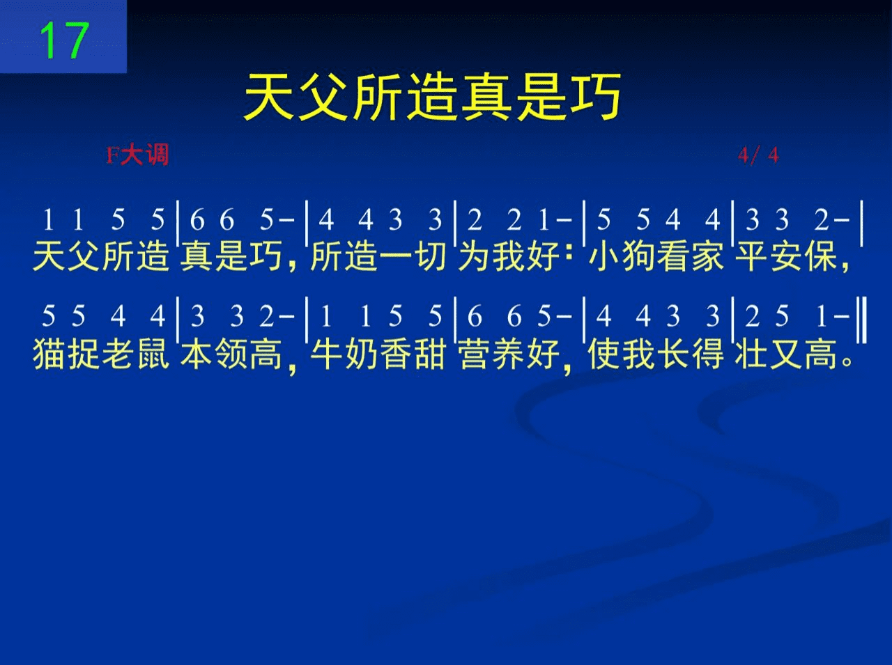 天父所造真是巧,所阅慊切为我好:小狗看家平安保,猫捉老鼠本领高,牛奶香甜营养好,使我长得壮又高。