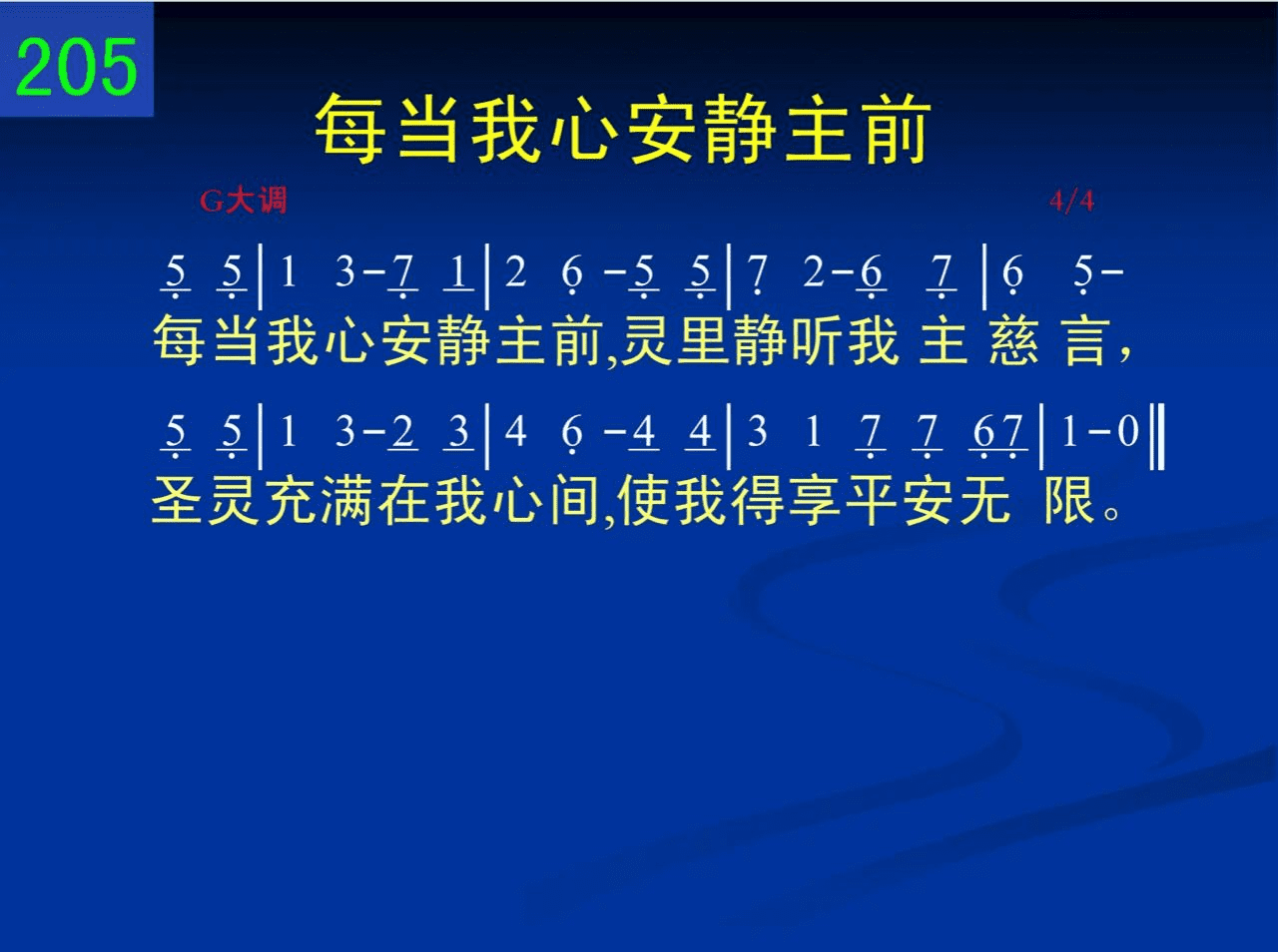 每当我心安静主前,灵里静听我主慈言,圣灵充满在我心间,使我得享平安无限。