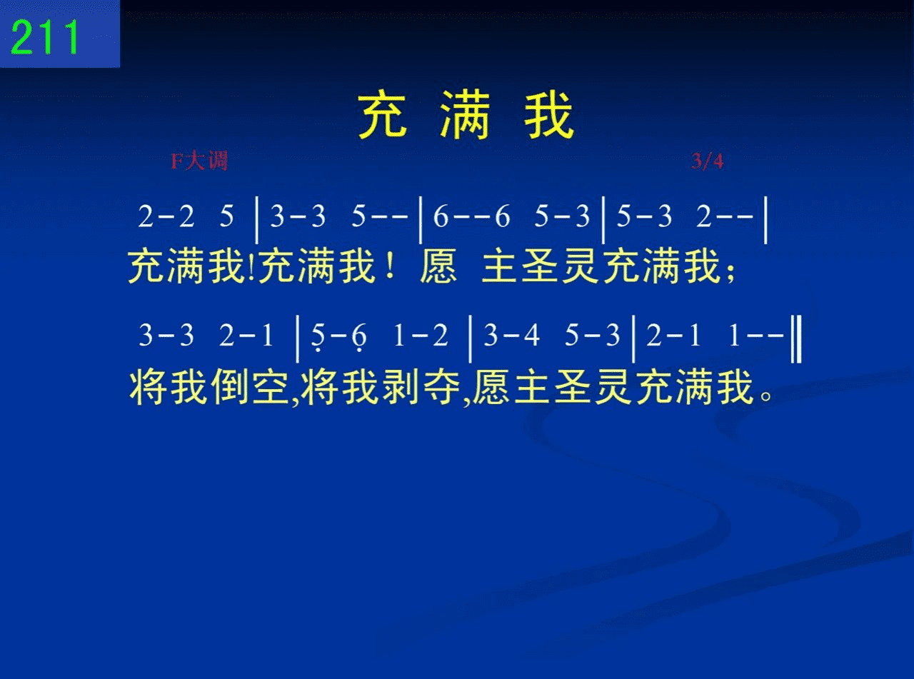 充满我!充满我!愿主圣灵充满我;将我倒空,将我剥夺,愿主圣灵充满我。