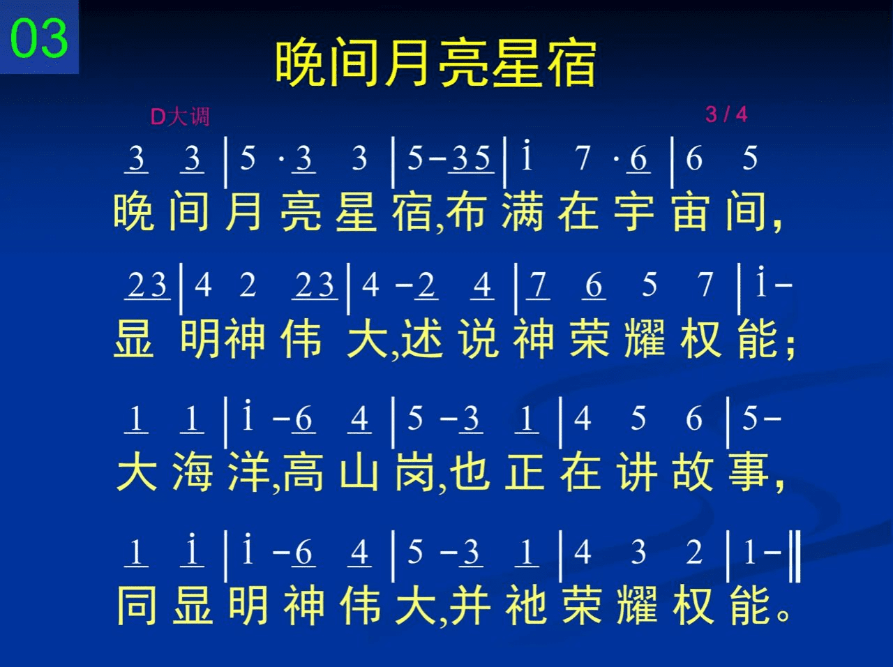 晚间月亮星宿,布满在宇宙间,显明神伟大,述说神荣耀权能;大海洋,高山岗,也正在讲故事,同显明神伟大,并祂荣耀权能。