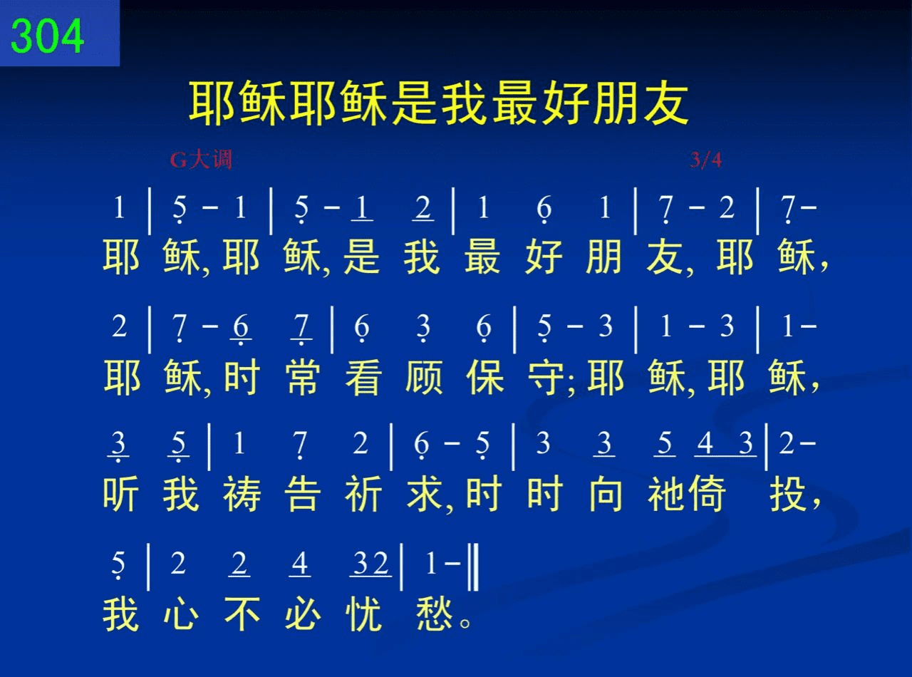 耶稣,耶稣,是我最好朋友,耶稣,耶稣,时常看顾保守;耶稣,耶稣,听我祷告祈求,时时向祂倚投,我心不必忧愁。